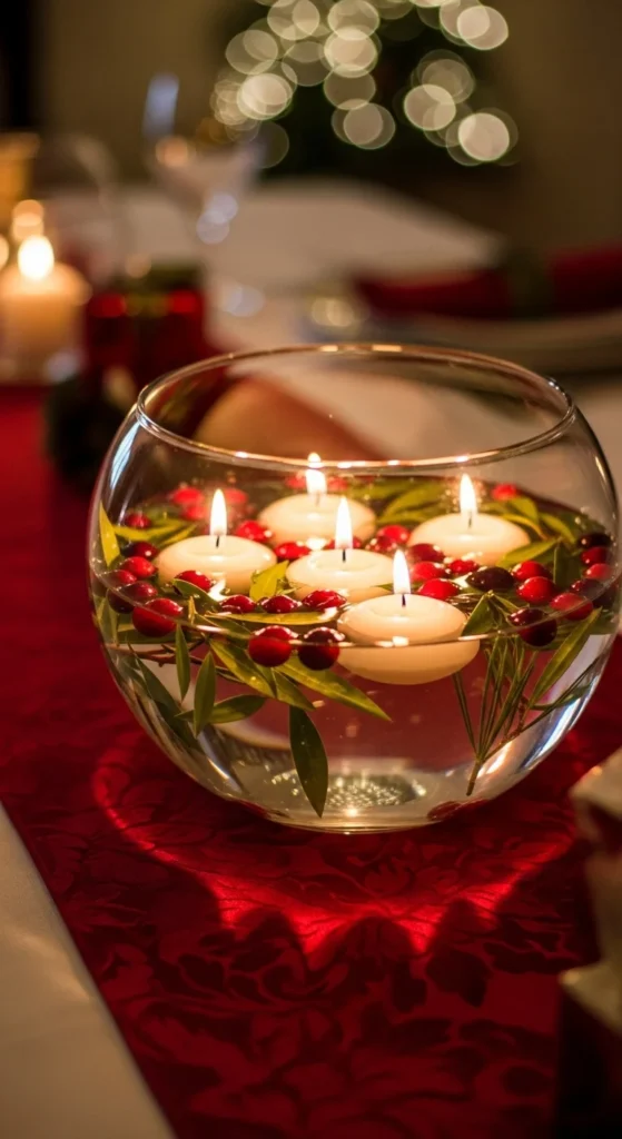 For an elegant touch, fill a glass bowl with water, cranberries, and floating candles. The glow on the water surface looks mesmerizing at night. You can make several smaller bowls and spread them evenly. It’s inexpensive, quick to make, and suits both traditional and modern decor.