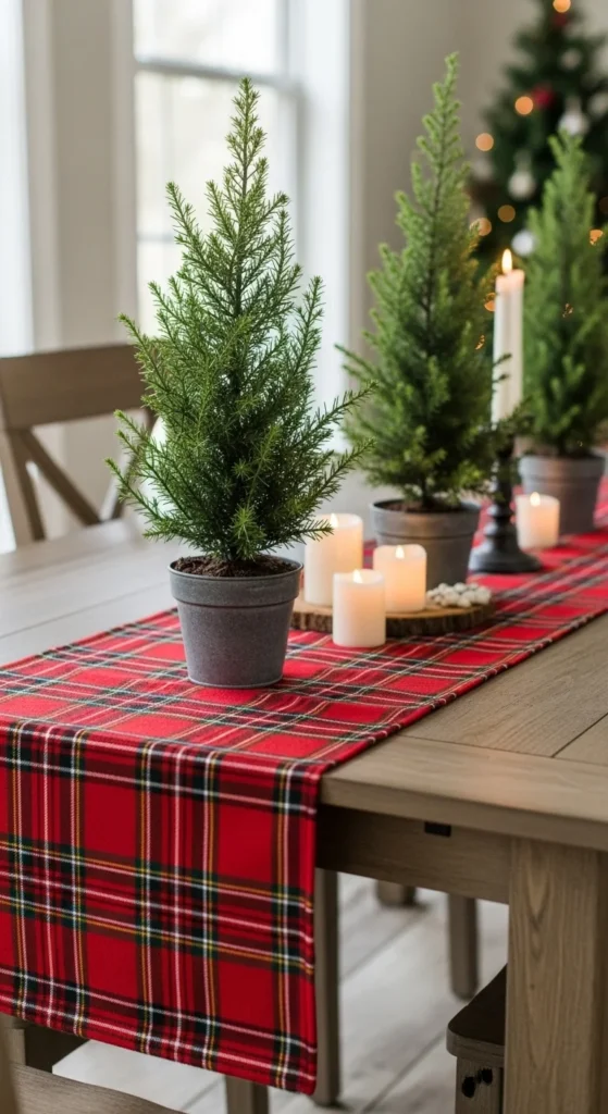 Set a plaid table runner down the middle, then line up mini potted trees or greenery bundles. Add simple white candles between them. This idea adds pattern and warmth without clutter. You can even gift the mini trees to guests afterward—a sweet touch.