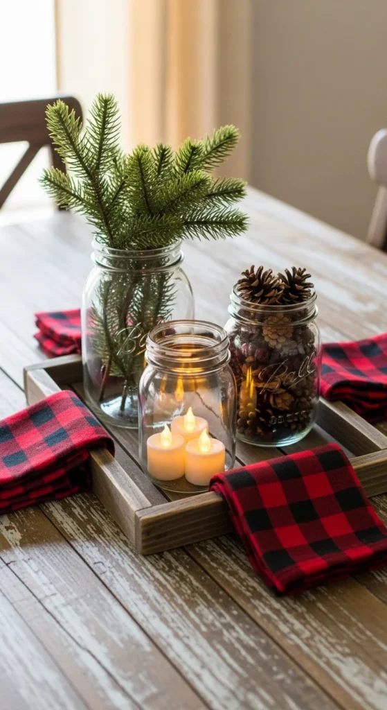 Use a wooden tray as your centerpiece base. Fill it with mason jars, pine sprigs, and candles for a charming farmhouse look. The best part? You can move it easily when it’s time to serve dinner. For extra detail, wrap twine around the jars and drop in cranberries for color. It’s warm, casual, and incredibly affordable to make.