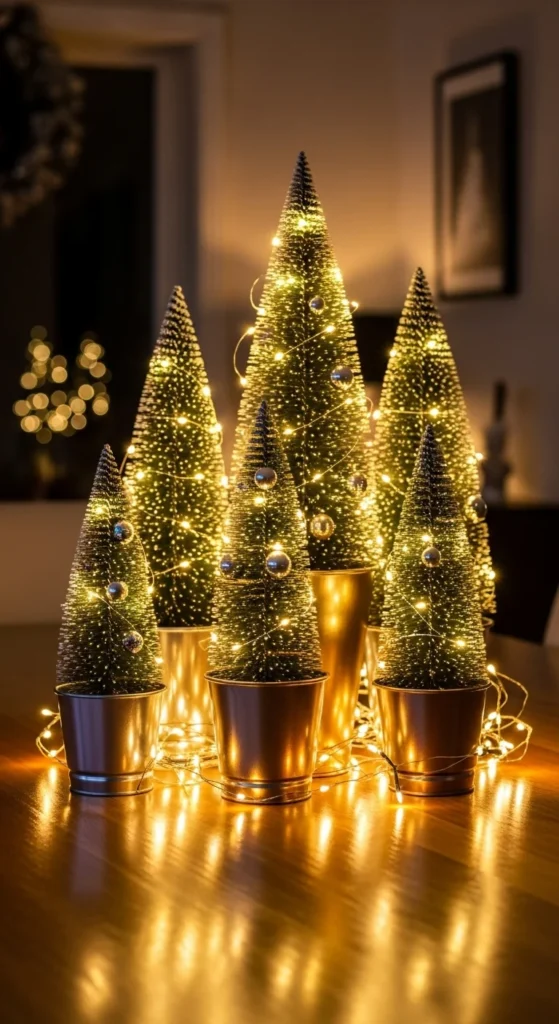 Pick up a few mini artificial Christmas trees and group them together. Choose trees in different heights for variety. Add fairy lights or small ornaments to match your tableware. Place them on a runner of faux snow or burlap for a winter wonderland vibe. This setup looks charming on long tables and fits modern spaces too.