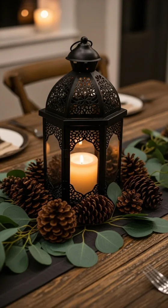 Lanterns make a striking holiday centerpiece. Use one large lantern or a few smaller ones down the center. Fill them with pillar candles and surround them with pinecones or berries. If you’re going for a minimalist look, keep it monochrome—white candles, black metal, and green foliage. It’s stylish and safe, especially with LED candles.