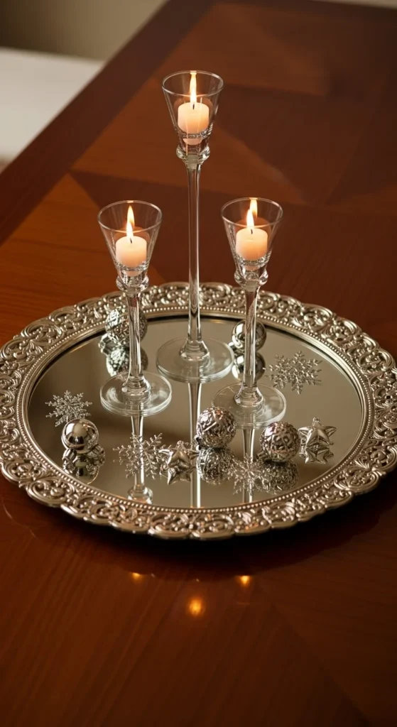 Use a mirrored tray as your base to reflect light. Add candleholders of varying heights, keeping tones metallic—silver, gold, or rose gold. Scatter small ornaments or beads to fill spaces. This style fits perfectly with glam or modern holiday tables. The reflection doubles the glow and adds depth to your setup.