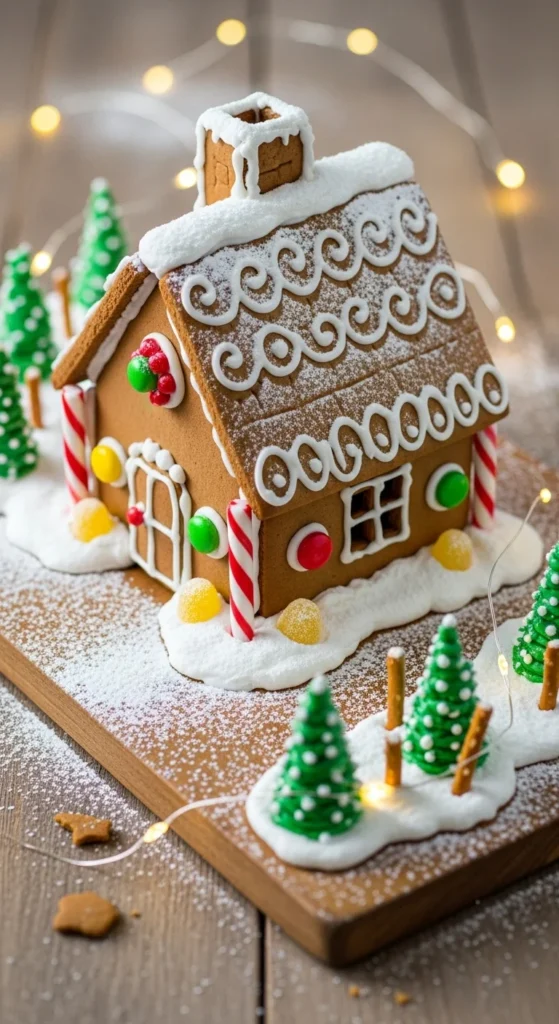 Turn your table into a mini gingerbread village. Use small houses, bottle brush trees, and powdered sugar for “snow.” Add fairy lights or tea candles to make it glow. Kids will love it, and it’s edible décor that smells amazing. You can even bake the houses together as a family activity before the dinner.