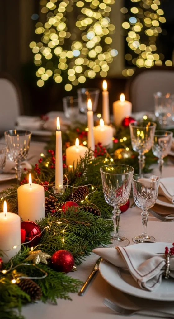Lay a strand of fresh evergreen garland down the center of your table. Add white taper candles in glass holders for glow. Mix in pinecones and cranberries for natural charm. This setup works for both rustic and formal settings. You can even use faux greenery if you prefer easy cleanup. Keep candles unscented so they don’t overpower the meal. It’s simple, timeless, and full of cozy holiday energy.