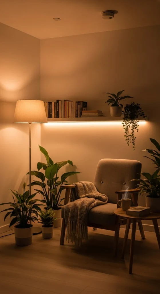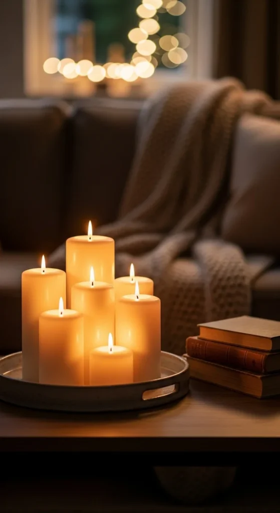 - Cozy and warm? Use amber tones, candles, layered lamps