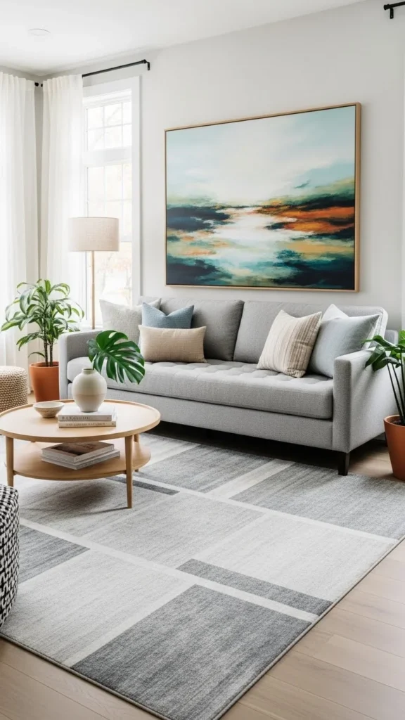 A good rug anchors the space, balances furniture, and makes the room feel finished.