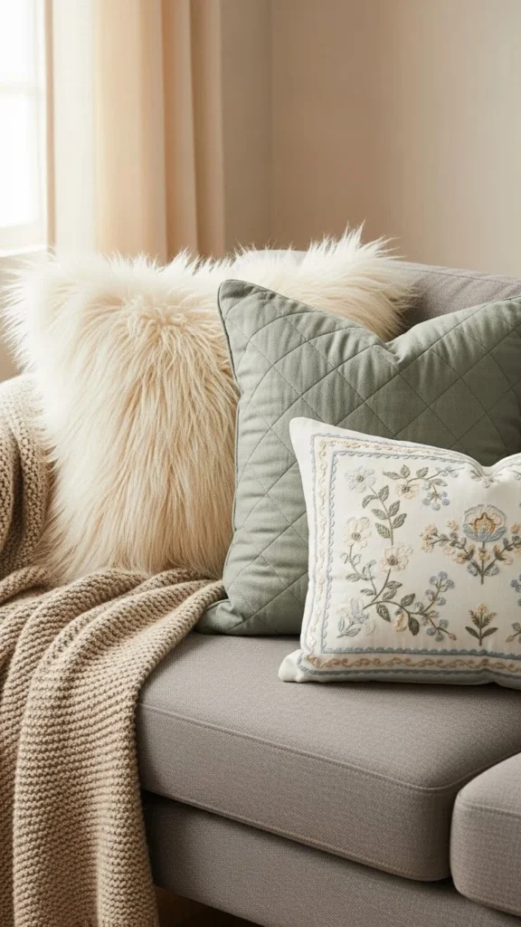 - Pillows with varied shapes and fabrics
