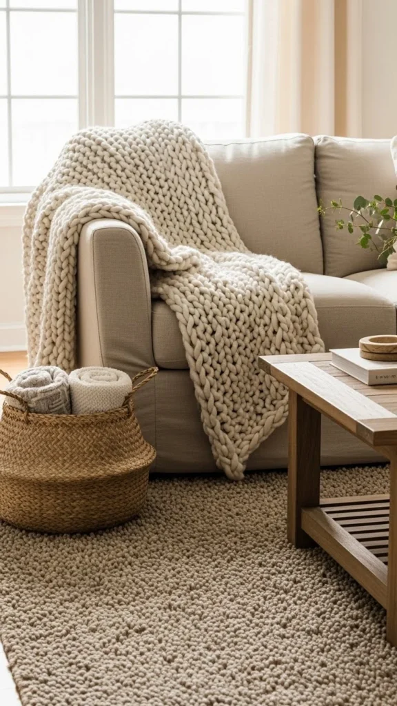 Choose materials with subtle natural texture such as linen, jute, wool, or soft boucle. These create an inviting canvas.