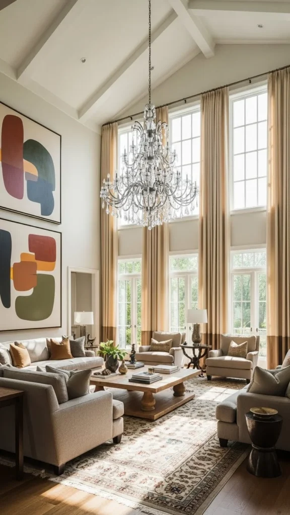 Floor-to-ceiling curtains enhance grandeur and make tall walls feel intentionally framed rather than bare.