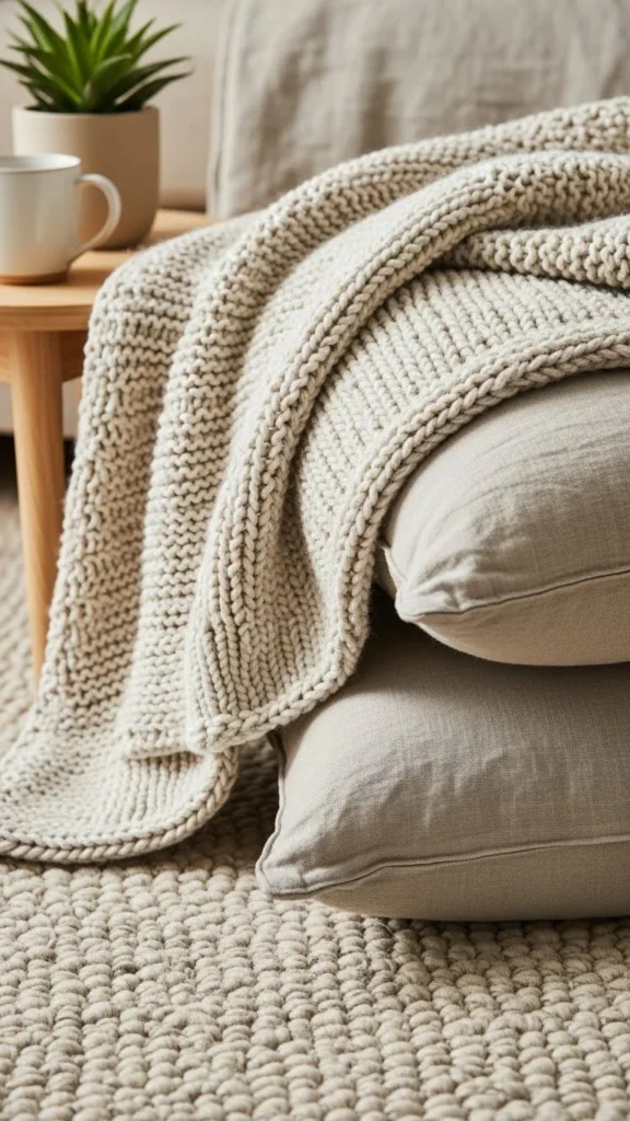 - Bouclé or knit throw pillows