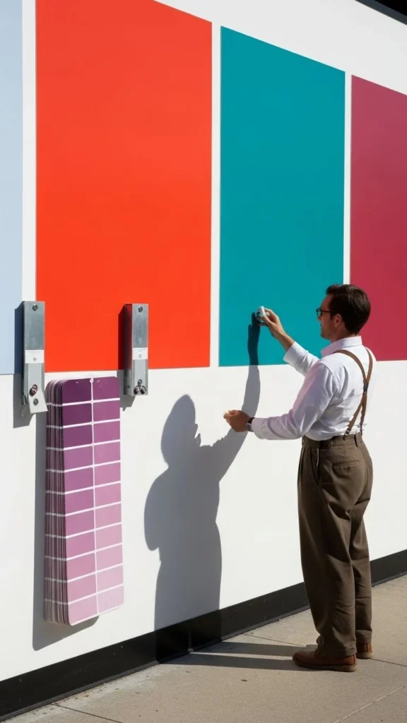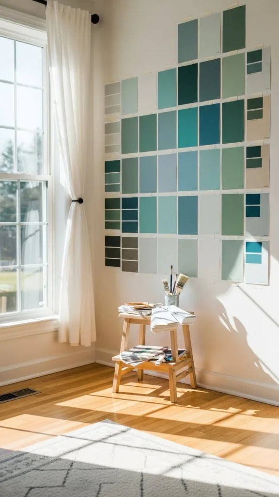 • Paint large swatches (12×12 inches or more).
