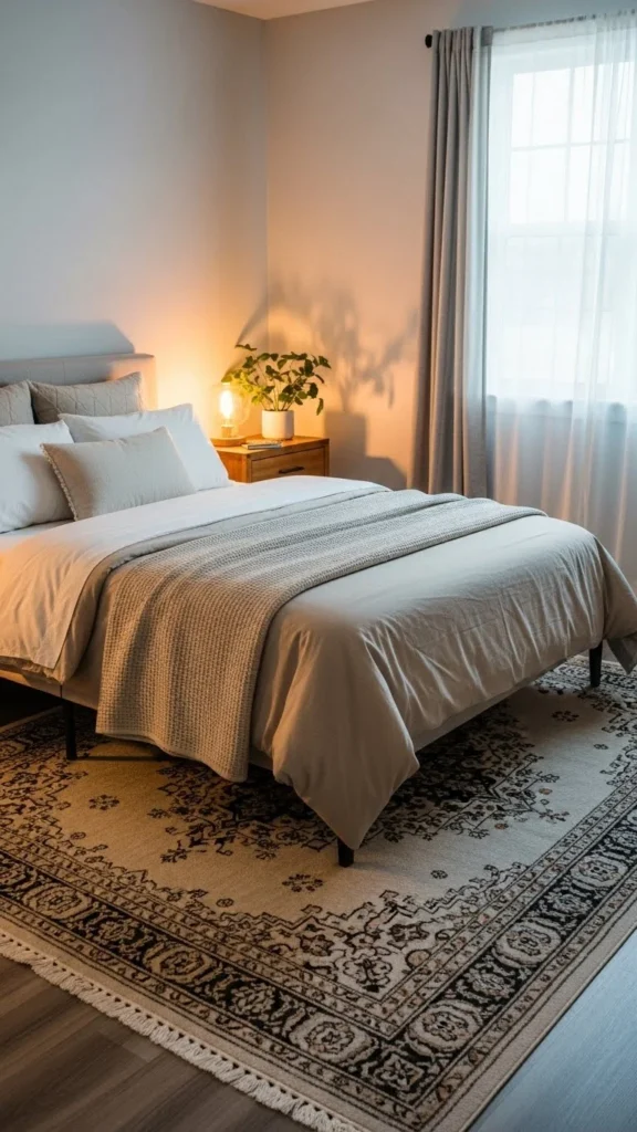 Avoid placing tiny rugs at the foot of the bed—they rarely look intentional.