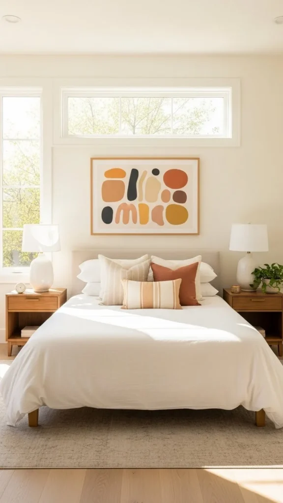 Artwork is a powerful focal point tool. One large, striking piece above the bed can completely transform the room.