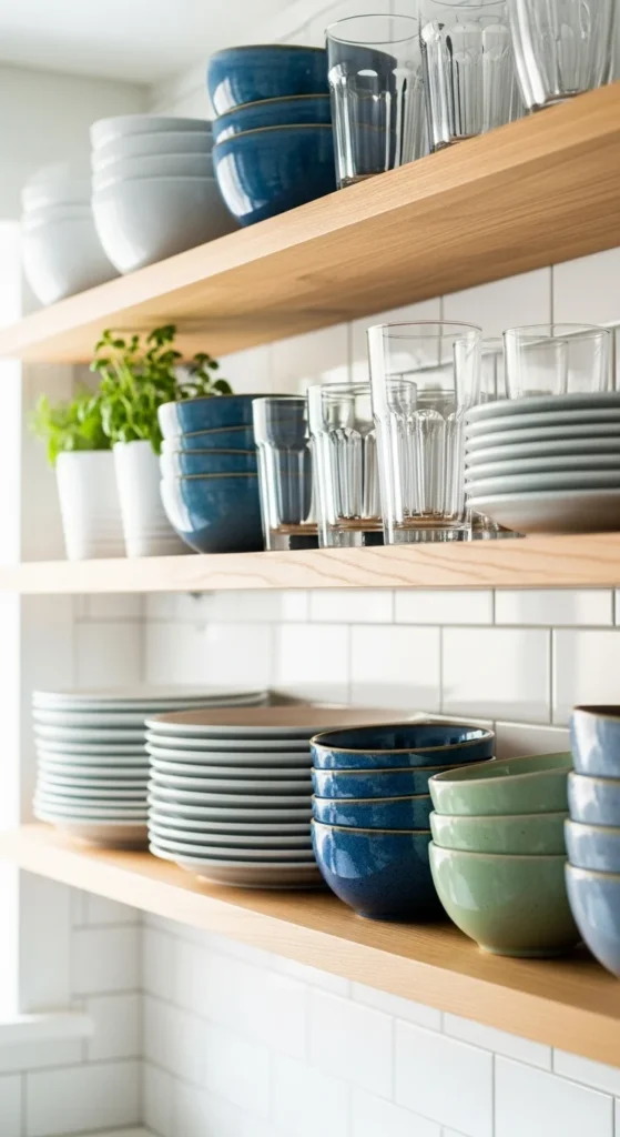 This makes shelves feel calm even when they’re full. Clear glass and neutral ceramics are especially helpful for visual balance.