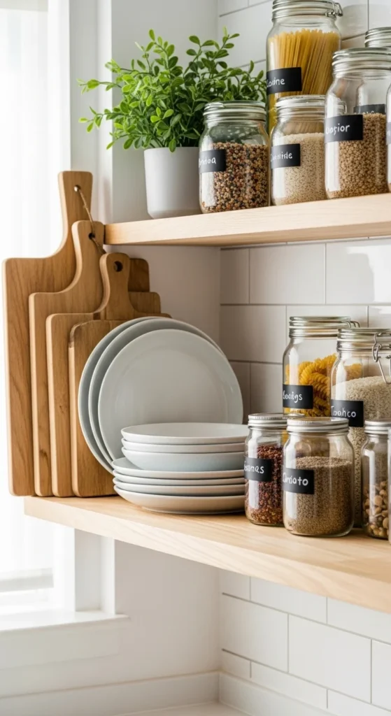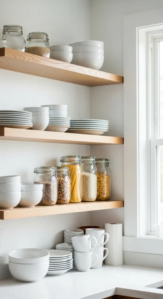 This balance keeps the kitchen practical while letting open shelves shine.