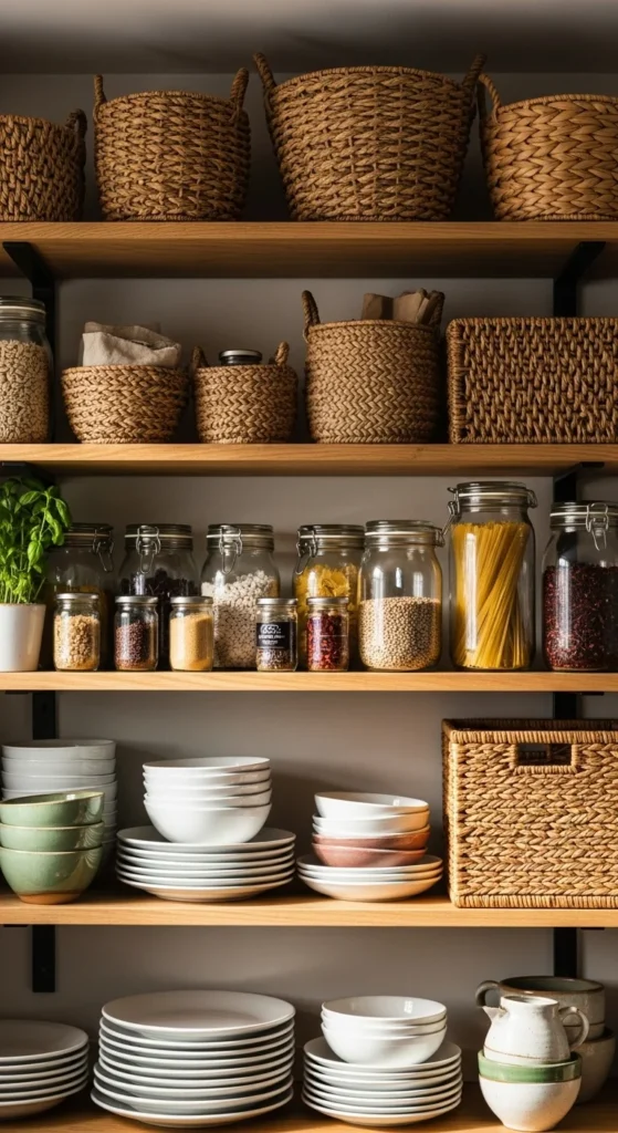 Not everything needs to be visible. Baskets and jars help control visual noise while keeping shelves useful.