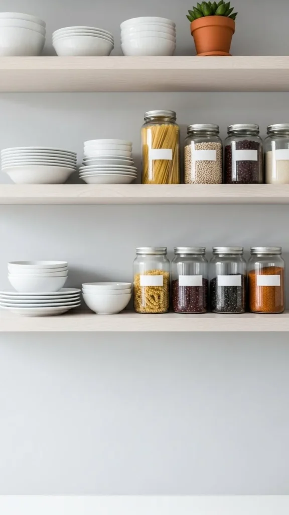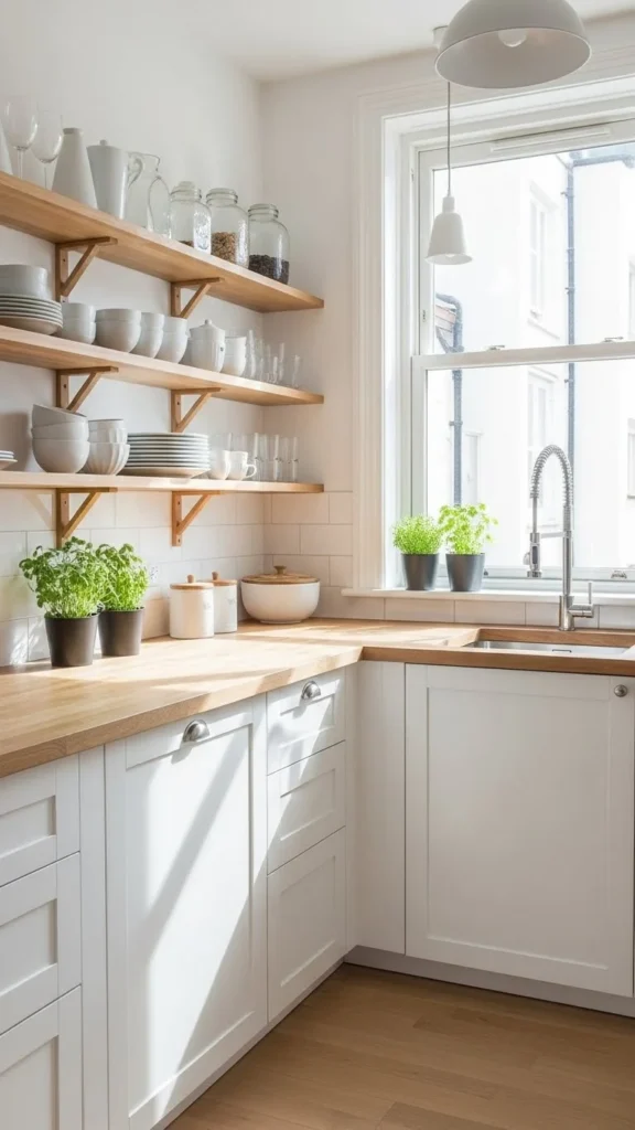 Open shelving can make a small kitchen feel lighter—but only if it’s styled intentionally. Overcrowded shelves create visual noise.
