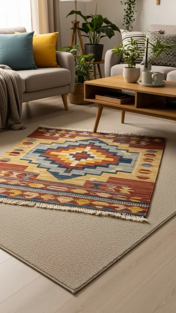 Rugs don’t always have to be perfectly centered. Angled or offset placements can make a space feel more dynamic.