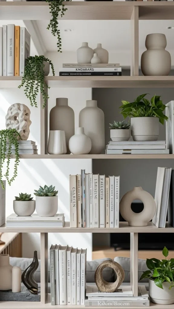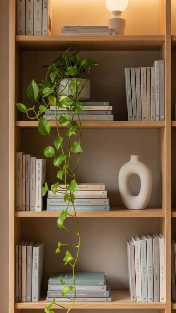 Plants add life, movement, and softness—perfect for breaking up the structure of straight shelf lines.