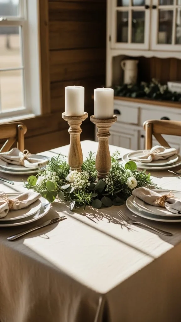 A glass vase + linen runner + metal candleholders creates a rich layered look that feels high-end while staying simple.