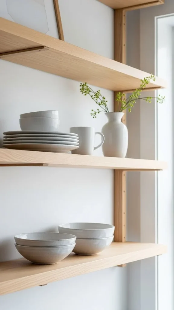 One of the biggest mistakes with open shelves is filling every inch. Empty space is not wasted space—it’s what makes shelves look curated.