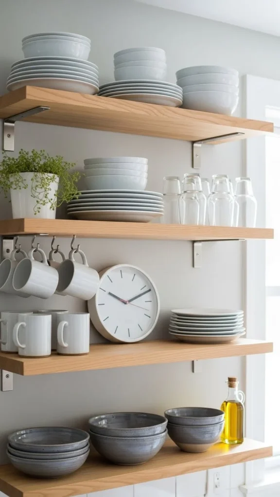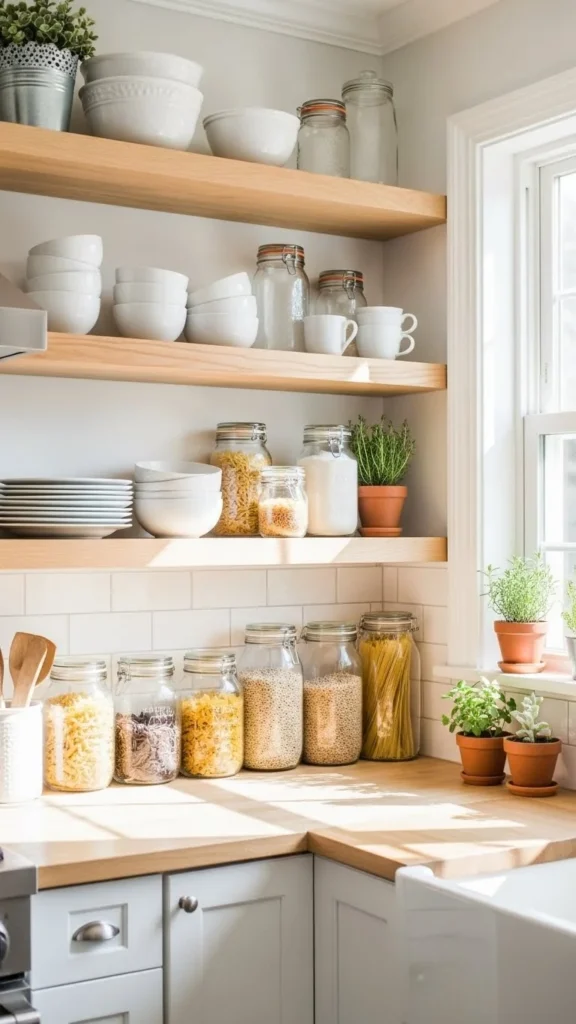 Styling open kitchen shelves like a pro isn’t about buying more decor—it’s about editing, grouping, and creating balance. When you limit colors, use everyday items, leave breathing room, and add warmth intentionally, your shelves will look polished and practical.