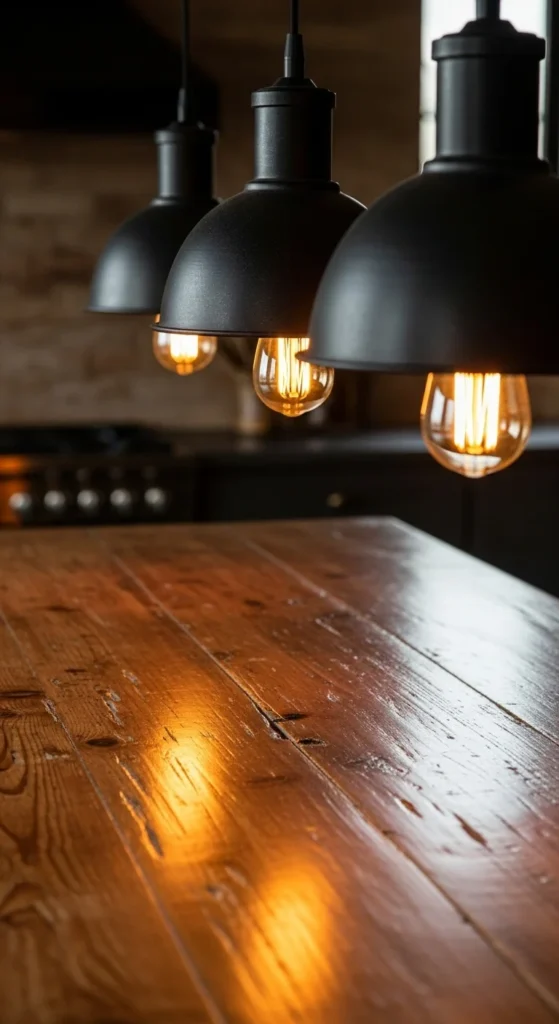 Use warm bulbs — golden tones elevate the industrial look and prevent harshness.