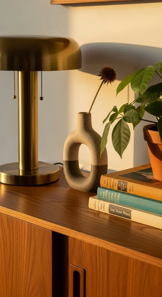 Mid-century decor celebrates personality and creativity. Instead of filling shelves with clutter, curate meaningful accents.