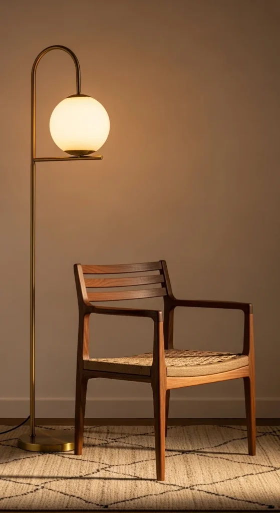 Lighting is HUGE in mid-century design. Think sculptural, warm-toned, and statement-making.
