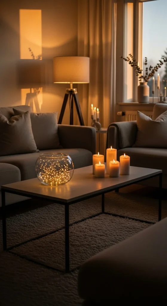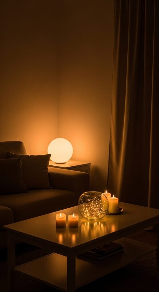 Lighting should feel gentle and calm — like a cozy evening retreat.
