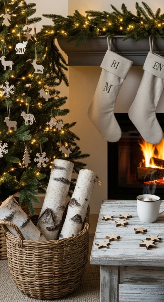 Birch and natural wood deliver rustic elegance. Place a bundle of birch logs in a basket. Use wooden ornaments, bead garlands, and carved stars. Pair with linen stockings and simple garlands for warmth.
