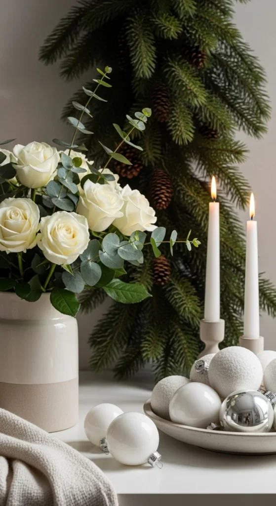 White winter florals bring understated elegance. Use faux or real white roses, ranunculus, or amaryllis paired with eucalyptus or pine. Place arrangements in ceramic or glass vases and keep the styling minimal.