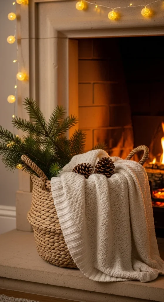 Baskets add warmth in neutral spaces. Place a woven basket next to the sofa or fireplace. Fill with cozy throw blankets, a pine branch, and a couple of pinecones. Tie a velvet ribbon on the basket handle for festive charm.