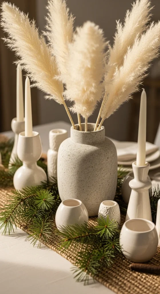 Blend pampas grass and gentle greenery like eucalyptus or soft pine. Place in matte vases and flank with candles. Keep tones warm and creamy. This hybrid look softens greenery while still feeling seasonal.
