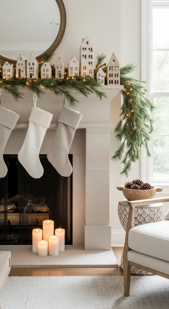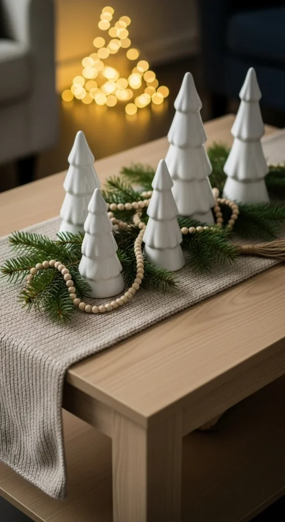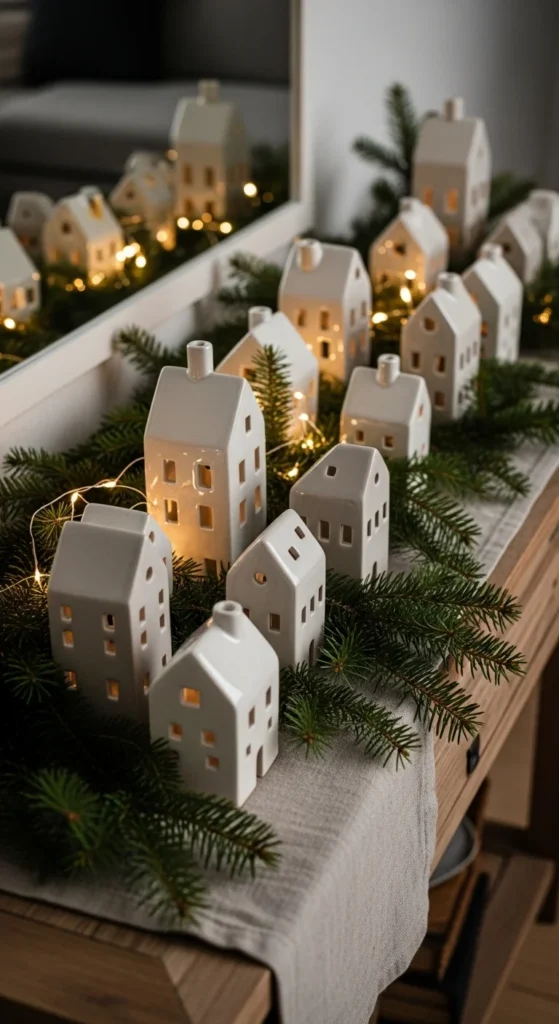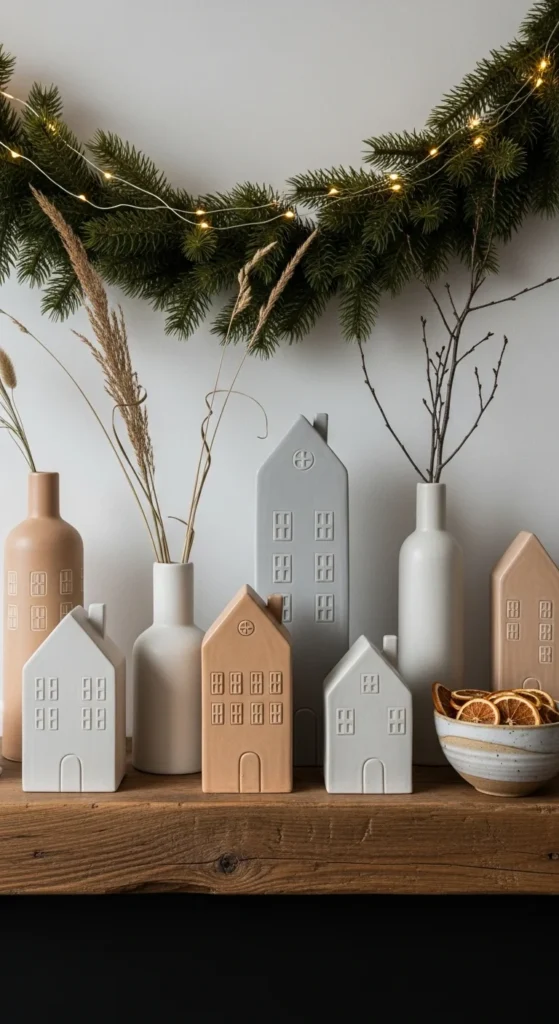 A tiny ceramic village creates quiet holiday charm. Choose small matte ceramic houses and space them apart on a console. Add subtle greenery and low fairy lights behind them for nighttime glow.
