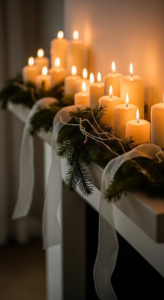 Let candlelight lead the atmosphere. Arrange pillar candles in various heights along a mantle or console. Lay a thin evergreen garland loosely around the base. Tie one linen ribbon end on the garland for softness.