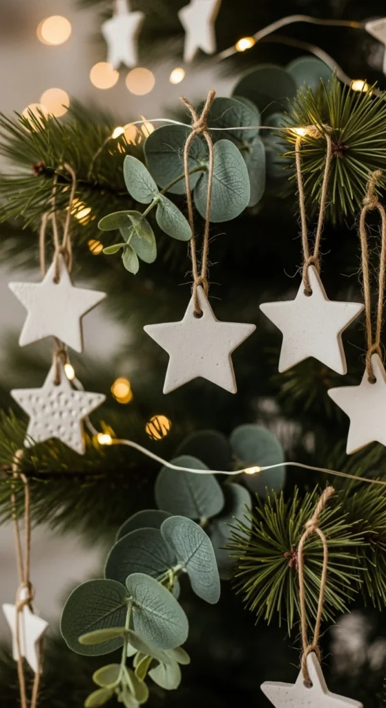 Clay ornaments feel artisan and personal. Create stars, bells, circles, or tree shapes using air-dry clay. Punch holes, thread jute twine, and hang on a neutral tree or garland. Keep shapes simple and tones natural.
