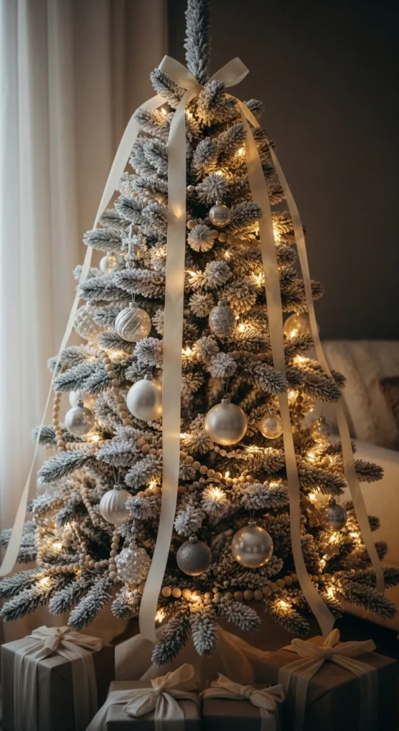 A soft flocked tree pairs beautifully with neutral styling. Use cream ribbon, pearl ornaments, wood beads, and warm lights. Skip bold accents. Keep ornament style consistent and spacing gentle.