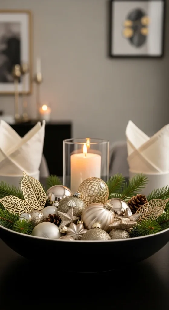 Add metallics in soft, brushed tones — champagne, pearl, muted gold. Style them sparingly through bowls, small ornaments, or candleholders. Pair with linen, wood, and glass for balance. Avoid shiny brass overload — subtle shimmer feels elegant.