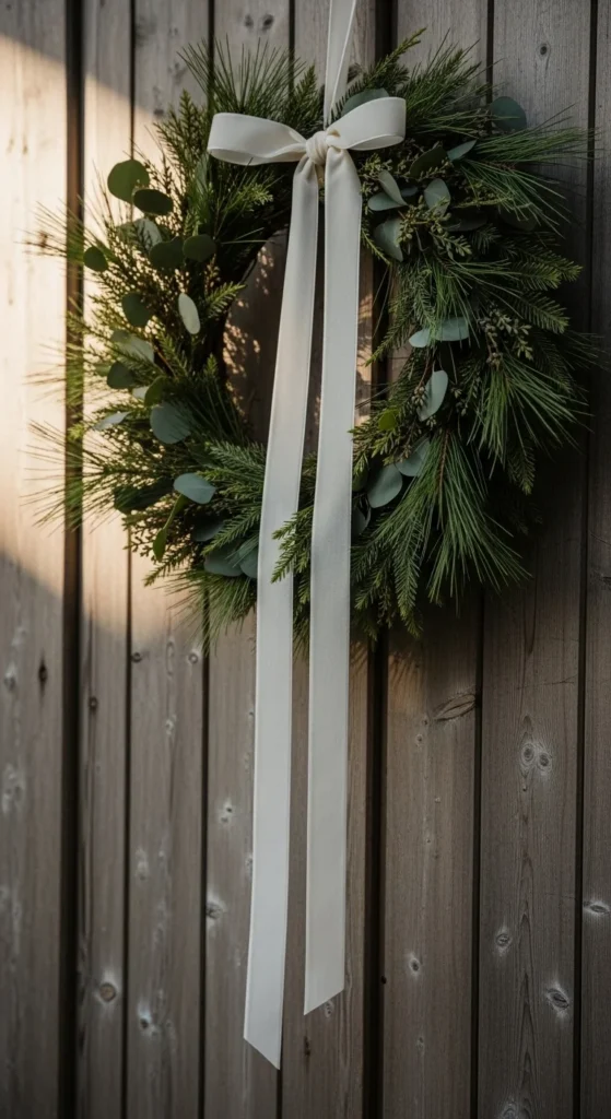 Choose a natural wreath made from pine, cedar, or eucalyptus. Add a single velvet or linen ribbon tail — long, soft, and unstructured. Skip extra ornaments or bows. Let the foliage shape stay organic.