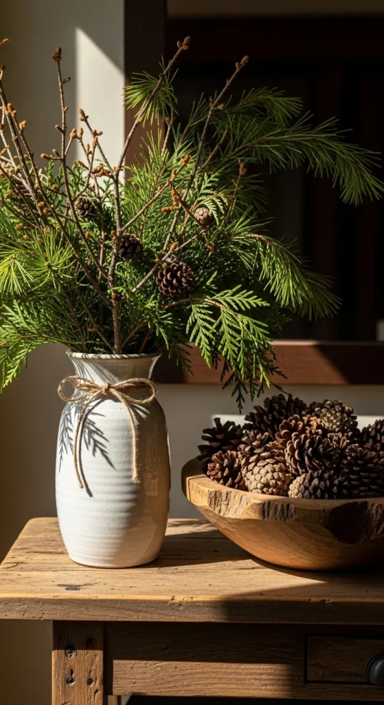 Fresh greenery brings life without needing bold color. Forage pine, cedar, and eucalyptus branches to place in vases. Display pinecones in bowls. Layer greenery on mantles, shelves, and tables. Keep lights warm and minimal.