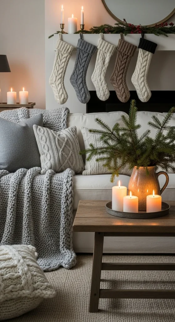 Knits soften the room and add gentle holiday depth. Use cable knit stockings, chunky throws, wool pillows, and textured blankets. Keep colors in ivory, oatmeal, and soft taupe. Add a simple pine wreath or garland to balance texture with greenery.