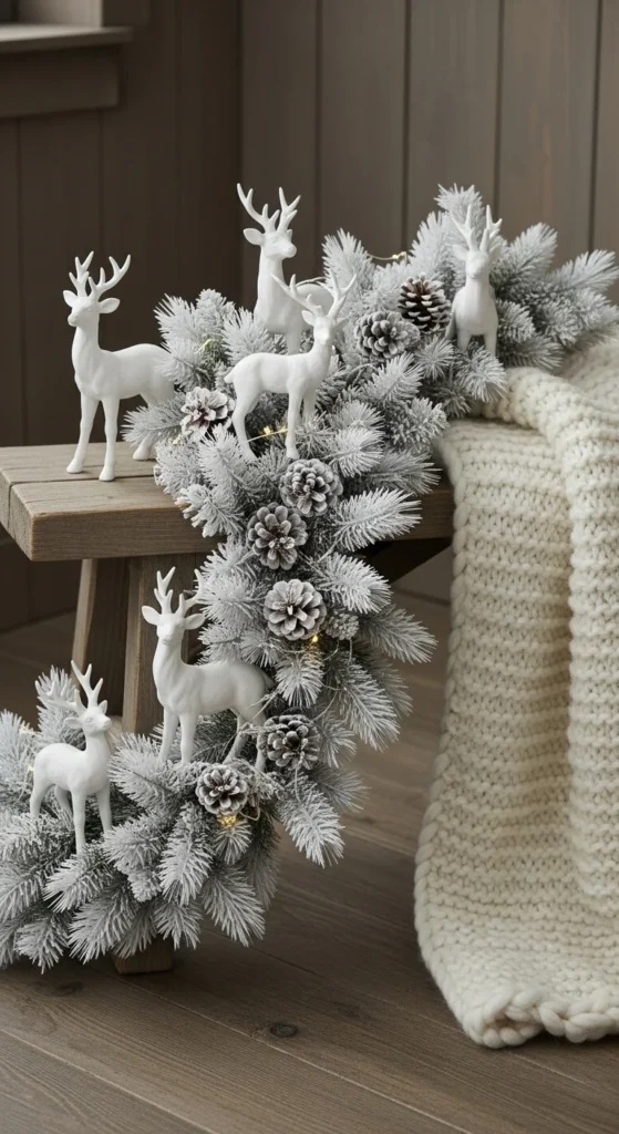 Create a peaceful woodland look with whites, soft grays, and natural textures. Think white pine stems, ceramic animal figurines, lightly frosted pinecones, and wood accents. Use soft fairy lights for glow. Layer textures — a knit throw, felt ornaments, and raw wood pieces.