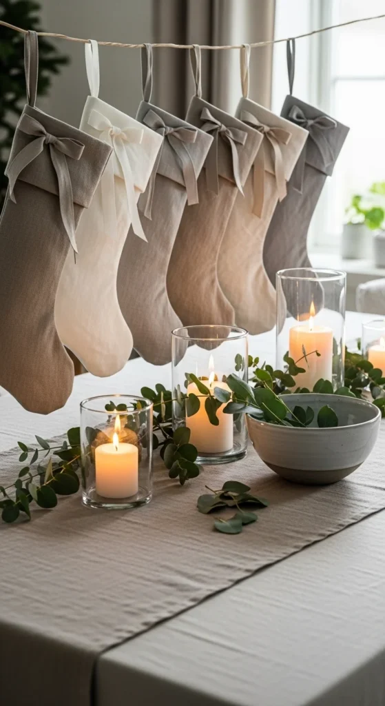 Taupe linen feels grounded and elegant. Style a table or mantle with a linen runner, matching stockings, and neutral ribbons. Add clear glass candle holders and soft eucalyptus stems. Keep the palette earthy: taupe, beige, cream.