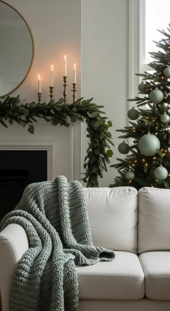 Sage green paired with ivory creates peaceful holiday balance. Use sage ribbon, soft green ornaments, and eucalyptus garlands. Keep metallic touches limited — brushed gold only. Layer ivory pillows and knit throws for warmth.