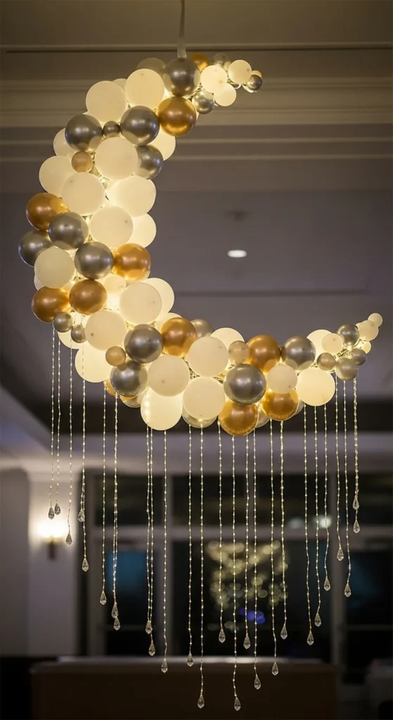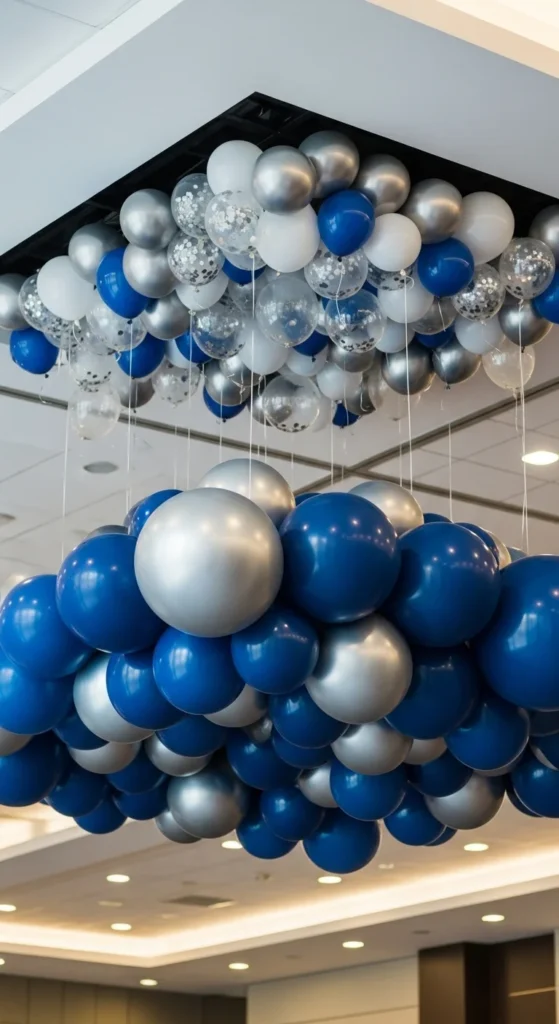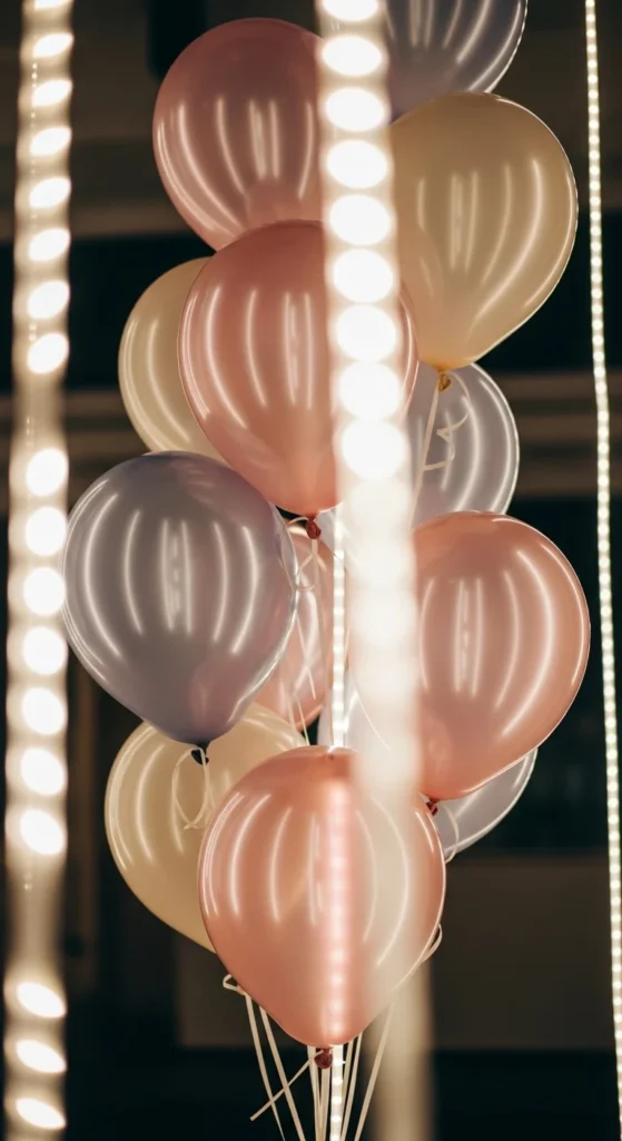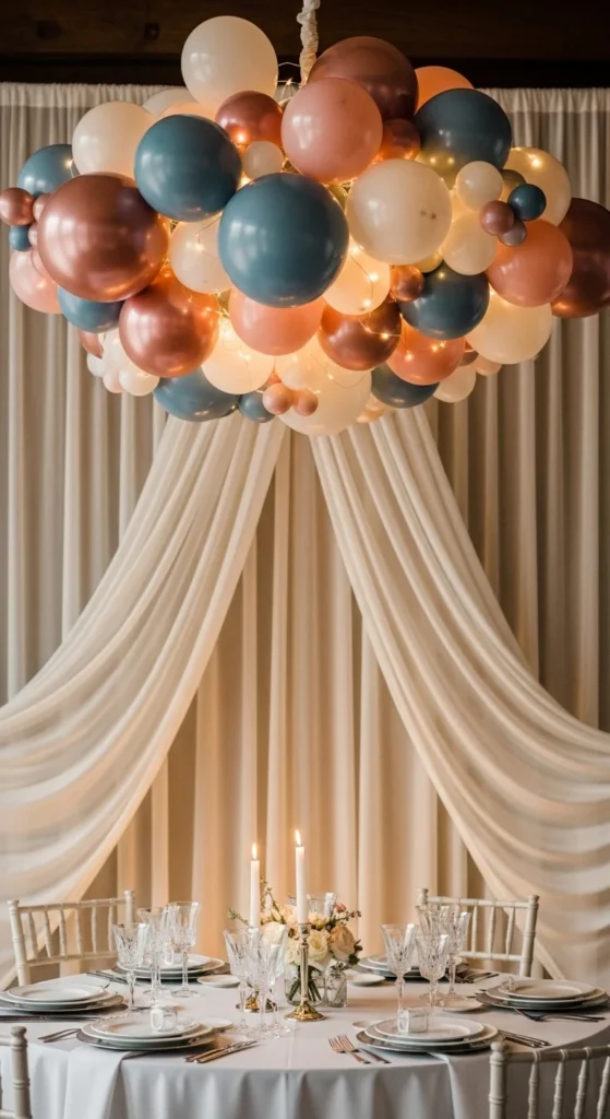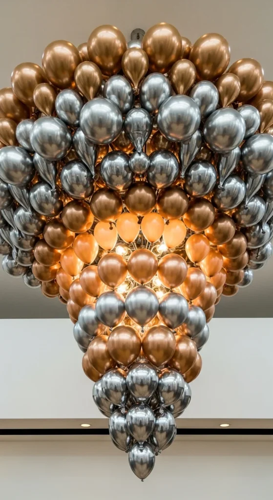 Use metallic balloons in three tones and form a dome-shaped cluster at the ceiling center using clear tape strips or command hooks with balloon fishing line. Mix large balloons at the base and smaller ones around edges for a dome feel. Add micro-fairy lights woven loosely so glow remains subtle. This design works above a dining or dessert station because it creates a visual anchor without blocking movement. Apply staggered balloon sizes for smooth transitions and avoid oversizing near lights. Consider a reusable balloon garland strip for easy shaping. Pop any balloon that sits awkwardly and replace with a smaller size. Store extra balloons inflated separately to replace any that deflate by party time.
