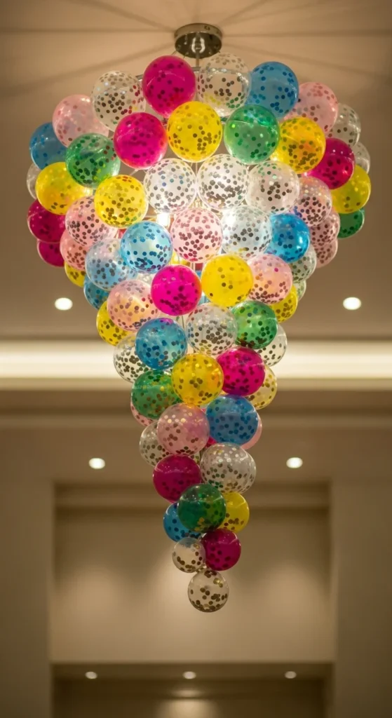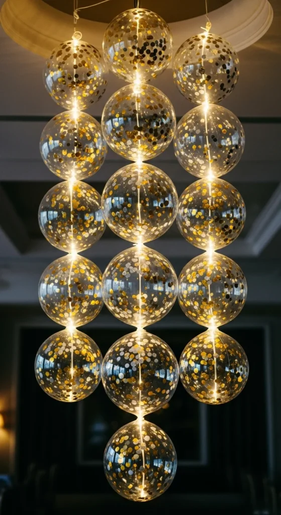 Hang clear confetti balloons from the ceiling using invisible thread. Vary lengths to create cascade lines. Add small LED lights inside select balloons for sparkle. Use confetti colors in gold or champagne so reflections stay calm. Place installation above a table runner to pull the look together. Anchor each thread with micro hooks so no knots show. This setup works in narrow rooms because it creates vertical drama with minimal floor space.