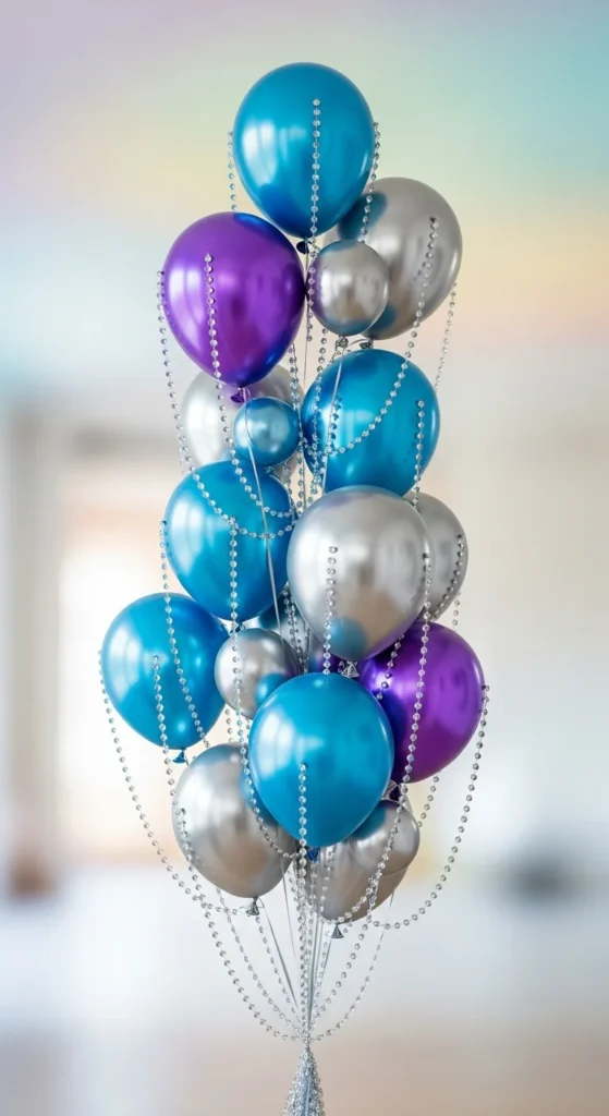 Connect balloons with crystal-like bead strings for a jewelry effect. Position above tables where overhead sparkle matters. Use small beads for subtle charm. Avoid heavy beads to prevent sagging.