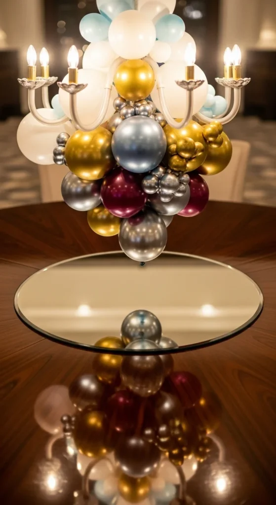 Place a large mirror plate directly under your chandelier. This doubles visual impact without extra balloons. Use metallic balloons for best reflection. Works above dining or snack tables.