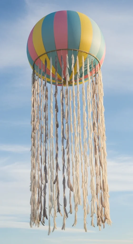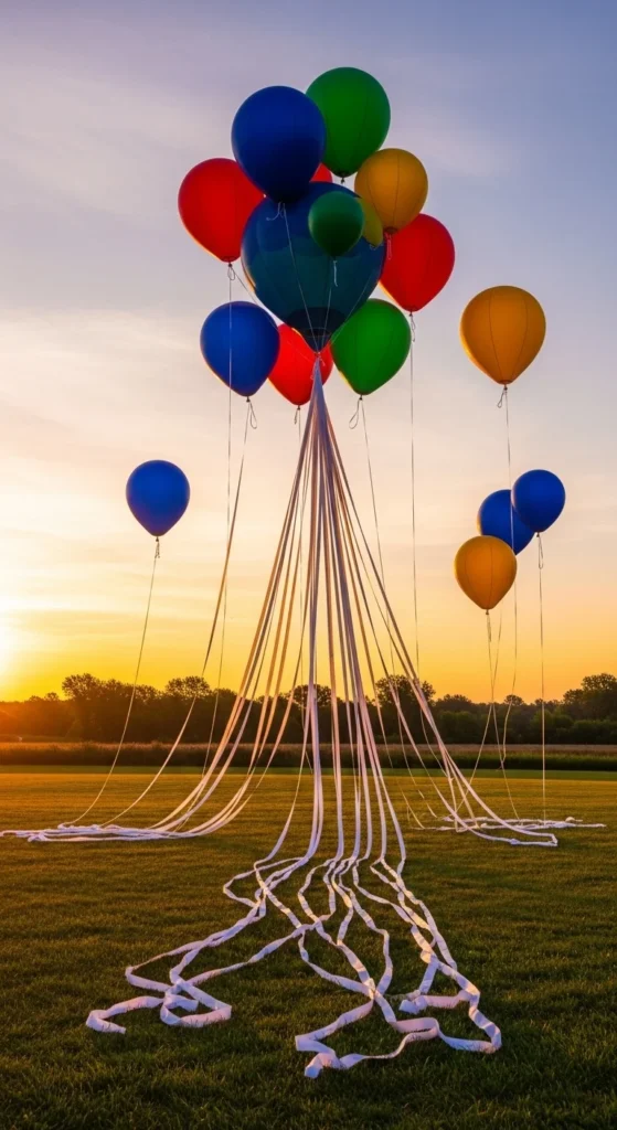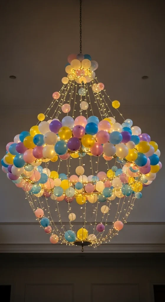 Use a lightweight hoop frame and attach balloons around it to mimic a suspended halo. Hang from four points for even weight. Add fairy lights wrapped loosely around hoop. Center above a dining table for symmetry. Keep balloon size small to maintain ring shape.